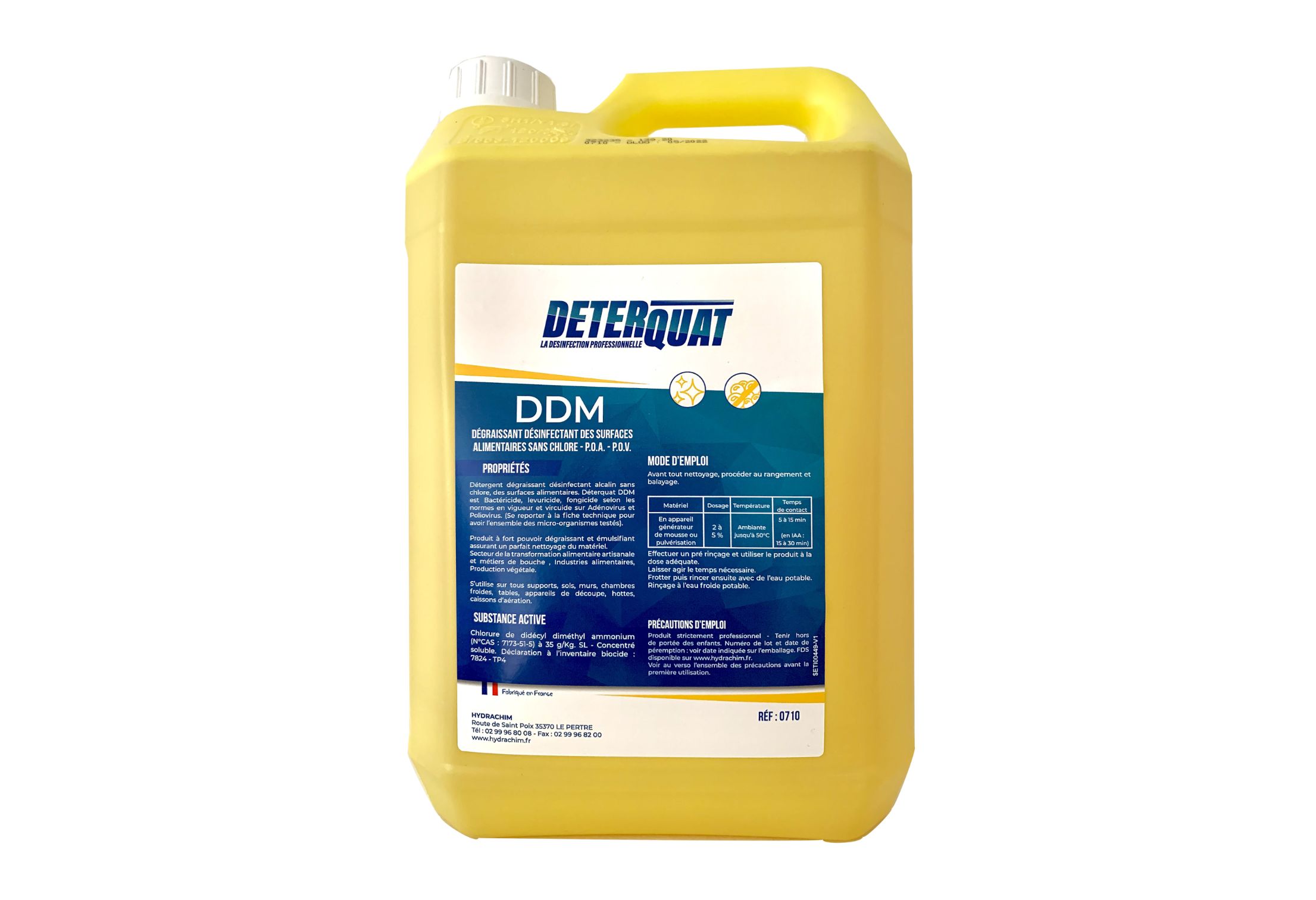 Le DETERQUAT DDM NF est un super dégraissant désinfectant sans chlore actif, idéal pour les surfaces alimentaires et non alimentaires. Son pouvoir dégraissant et émulsifiant permet de dissoudre graisses et huiles lourdes, tout en assurant nettoyage et désinfection efficaces.